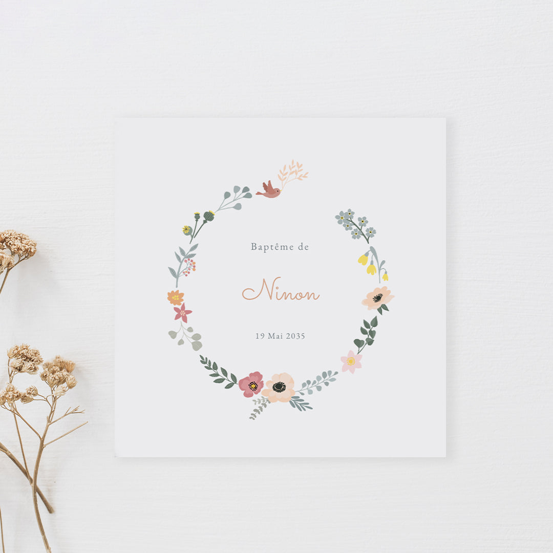 Annoncez avec tendresse le baptême de votre enfant grâce à ce faire-part délicatement fleuri aux teintes douces et naturelles. Son design champêtre...