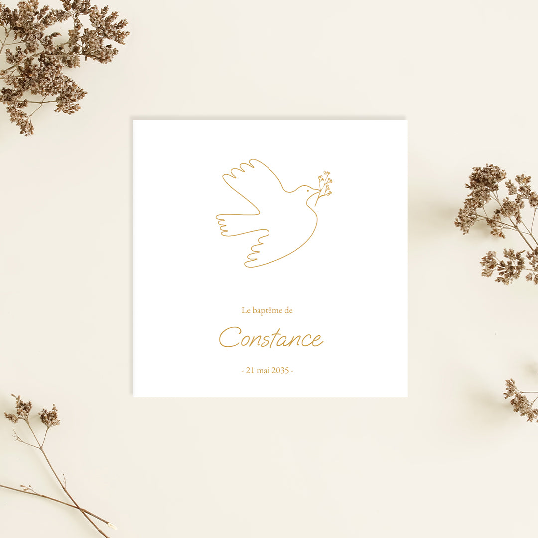 Célébrez un moment précieux avec ce faire-part de baptême au design sobre et raffiné. Son illustration délicate d’une colombe portant une branche f...