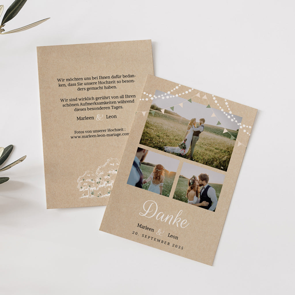 Nachdem Sie Ihre Hochzeit mit all Ihren Lieben gefeiert haben, möchten Sie sich bei ihnen bedanken, indem Sie ihnen ein Andenken an diesen schönen Tag schicken, das sie behalten können? Die Danksagungskarte Hochzeit im Lesezeichenformat ist ideal, um Fotos, die während der Feier aufgenommen wurden, zu teilen. So können Sie mehrere Schnappschüsse von sich und Ihren Gästen untereinander aufreihen. Eine andere Möglichkeit ist, ein einzelnes, symbolträchtiges Foto auszuwählen und es mit Texten und Illustrationen zu versehen, die Ihr Thema aufgreifen: Natur, Reise, Film, Romantik usw.