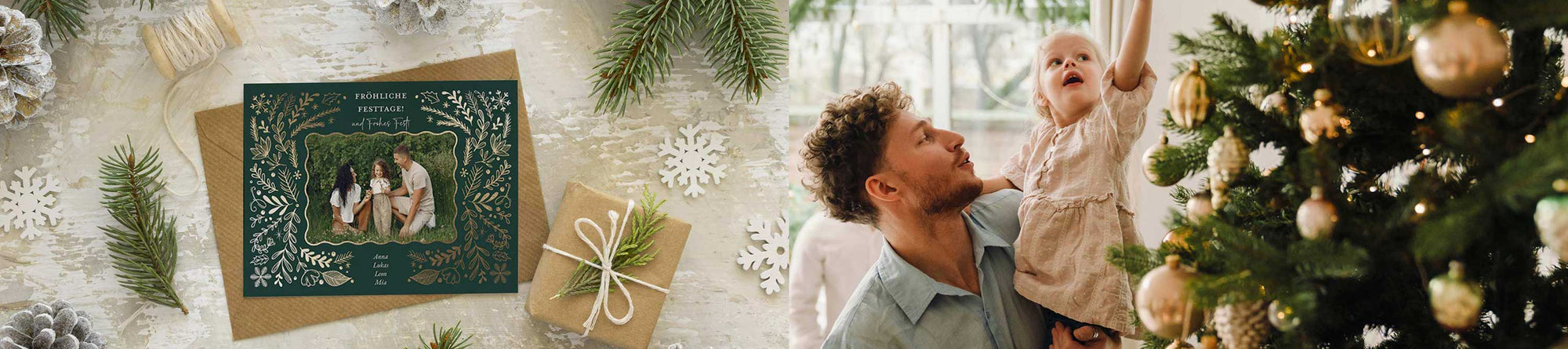 Zum individuelle Weihnachtskarten zu gestalten, wählen Sie einfach das Layout aus, das in etwa Ihrer Vorstellung der fertigen Karte entspricht. Anschließend haben Sie im Online-Editor die Möglichkeit, sowohl die Farben als auch die Textfelder Ihren Wünschen anzupassen. Fügen Sie auch Ihre eigenen Bilder oder Fotos ein, um Ihren Weihnachtskarten einen besonders persönlichen Anstrich zu verleihen! Mit nur wenigen Mausklicks wählen Sie die passende Papiersorte sowie ein Schnittformat aus.