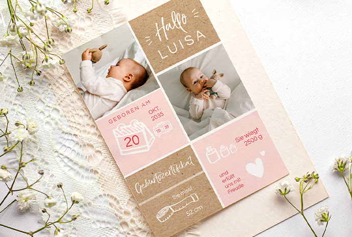 Klassische Geburtsanzeigen haben oft einen recht kurzen Text. Sie enthalten nacheinander die Ankündigung der Geburt durch die Eltern und den Vornamen des Neugeborenen und sein Geburtsdatum: