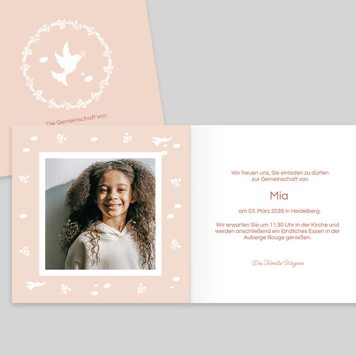 Kommunion Einladungskarten Vegetarische Krone und süße Tauben Mädchen