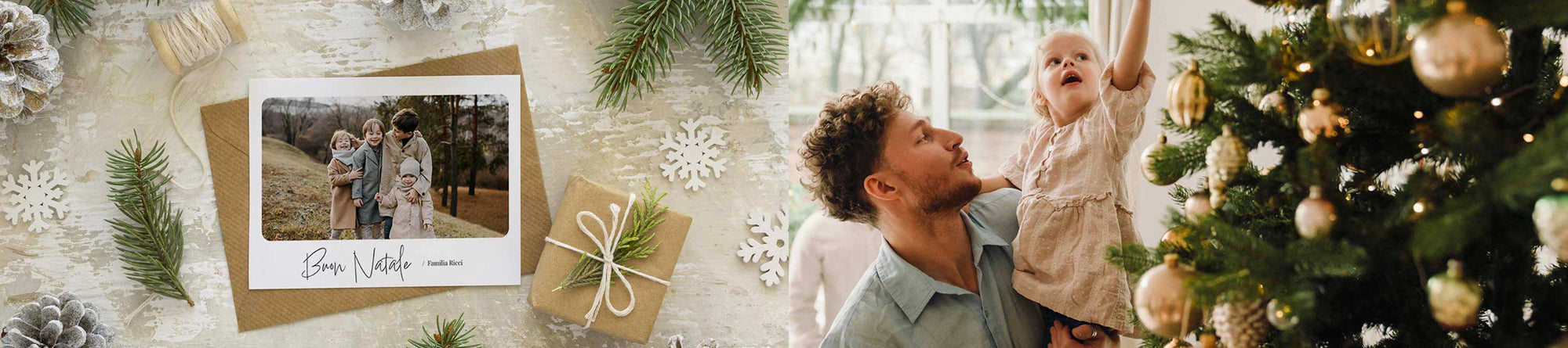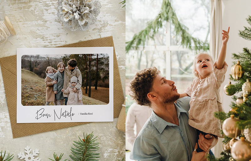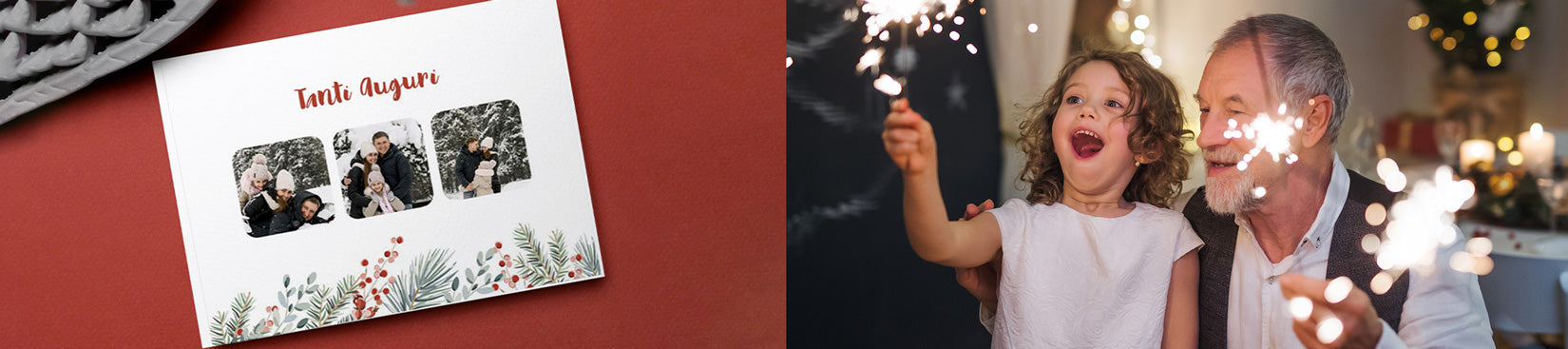 Invia un bellissimo biglietto di Natale personalizzato con le tue foto più belle. Date libero sfogo alla vostra immaginazione e prestate attenzione ai dettagli. Create la scena con alberi di Natale, orpelli, stelle di neve, la slitta stilizzata di Babbo Natale, un fuoco scoppiettante, animali della foresta... e molto altro ancora.